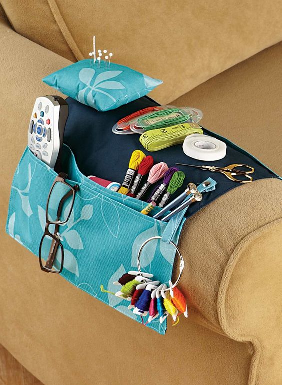 If you are like embroidery, knitting, any needlework that requires concentration and work with small objects, most likely you are sitting. If you do this on the couch or in the armchair, then the best variant for you could be such an organizer that can be conveniently placed on the armrest. Here you can sew several large pockets in which you hide everything you need!