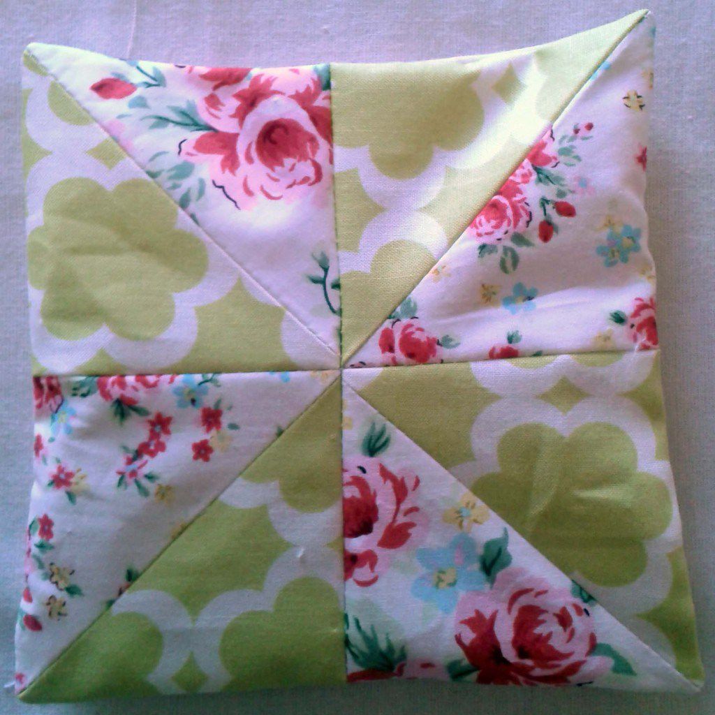 3. Create a composition from triangles. Form the squares of 13.5*13.5 from triangles and sew them by the line of the longest size. As result, you will have four colored squares, identical in size. Seam the squares, you should make two rectangles of 12.5*25 cm. Seam these two rectangles along the longer size. When the facial side of your pillow is ready, then trim the excess fabric in the corners to reverse size.