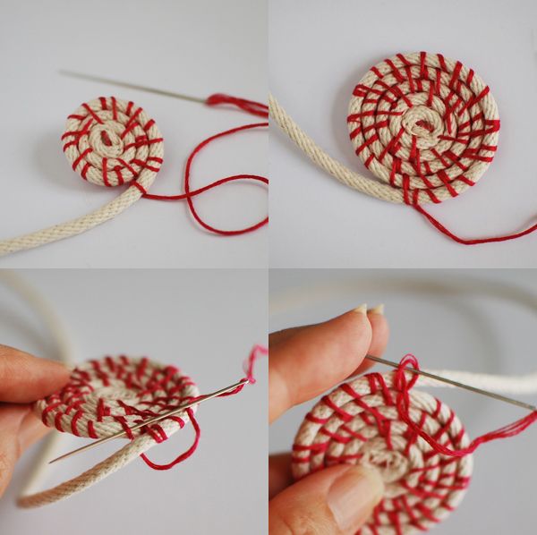 For the first round all stitches will wrap around both pieces. You should create a base and a new coil. When you are ok with a color of embroidery floss for the next part, make sure at least every second stitch passes through the rope in the first round. The base have to be tight but don't pay much attention to the color. Continue stitching, than cut the rope off on an angle so it tapers off. To finish off knot the thread around a stitch and run the thread between the pieces of rope below. Cut the thread off making sure the end is not visible.