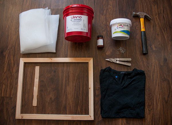 Mesh, silkscreen ink, wooden frame, photosensitive emulsion, t-shirt, sensitizer, flat nose pliers, nails, and hammer.