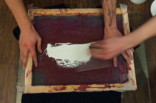 Lay the screen with its outer side on the T-shirt and press it. Spread the ink on the inside of the screen with strong abrupt movements. Then lift the screen neatly and put the T-shirt for drying.
