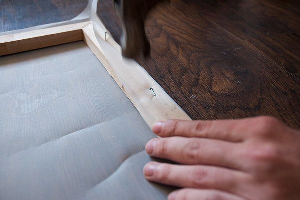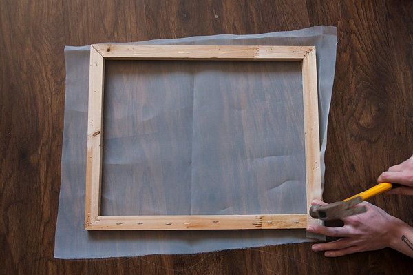 Cut the piece of the mesh for the size of the frame and stretch it as tight as possible, securing it with nails. Make sure no uneven or curved spots are left on the mesh, as it can affect the printing.