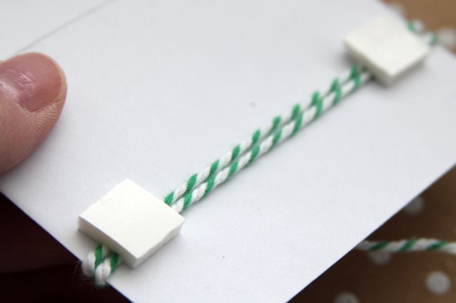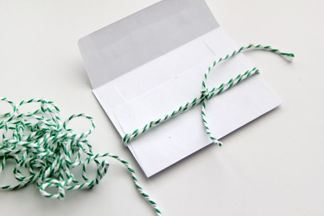 Tie the mini envelope with a length of green and white baker’s twine.