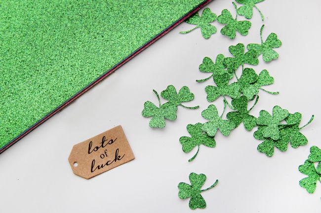 Begin your shamrock card by preparing your clover embellishments. From green Glitter Silk paper, punch or cut small shamrock shapes. Or you could skip this step and opt the really easy route with ready stickers.