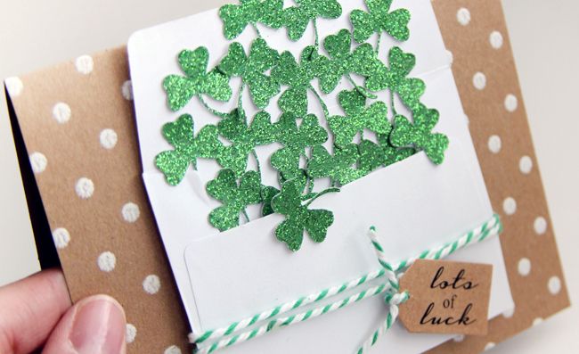 Begin adhering shamrocks to the card. Tuck some shamrocks into the envelope, and continue as desired.