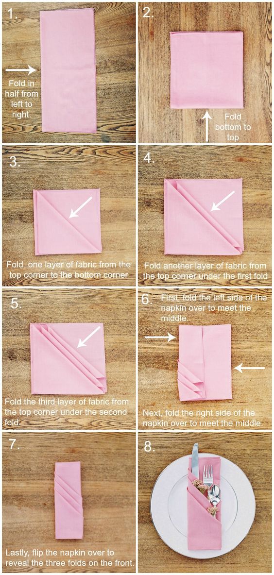 As for napkins here you can see whole instruction how to make an interesting original and beautiful napkins handmade. Napkins in form of pockets can be used for holding forks and knives or fresh herbs.