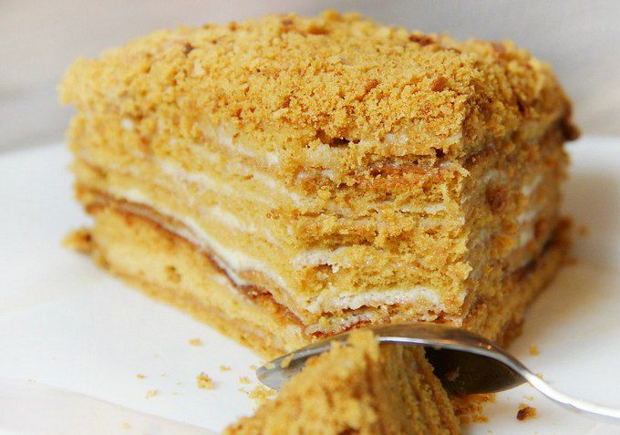 Preheat oven to 180 degrees. Put the mixture of oil, honey, sugar and water on fire and cook until boiling. Then remove it from heat and add there a mixture of flour and soda. You will get a choux dough. Divide it into 6-7 parts, roll out thinly and bake cakes until golden. Now, beat eggs with sugar, mix with flour, add cold milk and put on fire. It is necessary to stir thoroughly and constantly, until thick paste. Remove from heat, add vanilla and chopped nuts. Add butter in slightly cooled cream and whisk it with a mixer. Spread the cakes with cream and put the finished cake into the refrigerator for a few hours to soak and infuse.