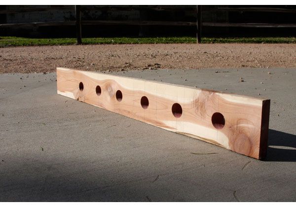 It is not difficult to make a rack like this if you have the proper tools. The only challenge is to make all the holes at the same angle. Then sandpaper it, paint or varnish it and hang it on the wall.