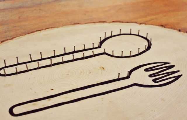 First you need to draw on the woodcut two sketches in the form of a spoon and a fork, using a pencil, and then outline them, using a black marker or acrylic paint.