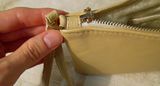 Designer's leather clutch "Golden" Made of leather of golden color with a drop of pearl luster. Your phone, wallet, keys, tissues, lipstick and some other stuff will fit into the chutch. Inside the clutch there is a small pocket. The inside of the bag is made of light-yellow viscose Short wrist strap. Dimensions: 25 x 12 cm No return or exchange