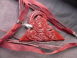 The pendant made of clay in the technique of filigree. The width is 6,5 cm, height is 4,5 cm.