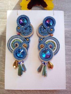 These unique dangle earrings were created using the soutache technique. Drop earrings made with crystals in the center, glass beads, rhinestone chain and soutache cord. These earrings combine perfectly with an ethnic outfit and add a touch of color to your outfit. Blue and green round pendant earrings are 3.8 inches long. This soutache earrings and are very light. Being a product made entirely by hand, for those who want to customize it or ask for more information contact me here crinnaxd@yahoo.it ***** The photos are made with natural light, without filters.