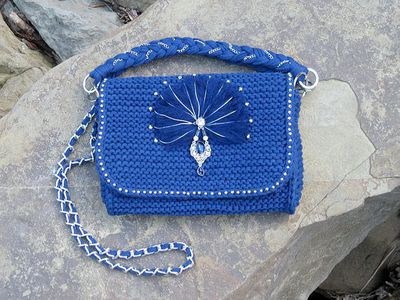 This orginal handbag is crochet of quality t-shirt cotton yarn. This bag is soft to touch while at the same time keeps its form very well. It is lined with 100% cotton fabric with two inside pockets and has magnetic clasp and silver color metal chain handle. Embelishment is created using wool and metalic yarn. Height: 17cm (6.69") Lenght: 22cm (8.66") Width: 5cm (1.96") Two short handles lenght: 43cm (16.92") Long handle lenght: 115cm (45.27")