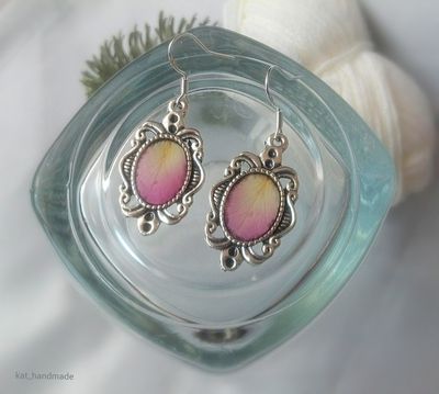 Vintage earrings with pink rose petals. Silvery metal finishing. 4,5cm total length. Comes with silicone plugs.