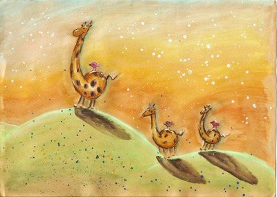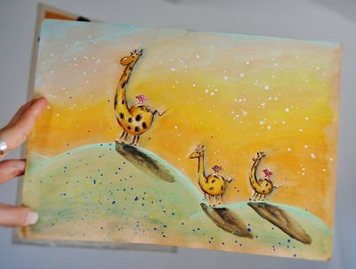 Hi there! Here we have some sweet giraffes walking on a field and where little birds choose to land to recover a bit :) A perfect addiction to the wall of your nursery. The paper is a soft yellow but the drawing occupies most of the paper. It's A4 size and it's made with watercolor colored pencils, The paper is for watercolor, too. If you have any question, message me! If you like but want different colors or animals just let me know, I'm open to requests:)