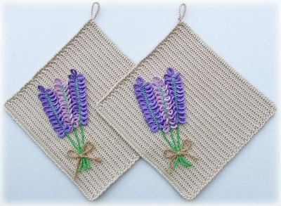 A set of pot holders is made of thick 100% mercerized cotton. Lavender application is made of thin 100% mercerized cotton.