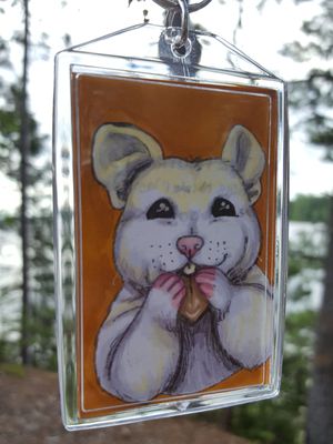 Feel stylish and show your love for hamsters and cute things with this acrylic keychain! This is a perfect gift for pet owners or hamster lovers! Each 2x3 portrait is drawn by hand in alcohol-based markers and pens and then sealed into the photo keychain, so some slight variations may occur. They are all handmade copies of an original portrait I did of a hamster named Nibbles. | Customization exists in that you can request a different color background - at no extra charge - than the orange shown here. Please just specify in a note if you would like a certain background color, and I'll take care of accommodating you. For an additional $1, you can have a sturdy steel swivel clip added to the key ring.