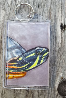 Feel stylish and show your love for turtles and reptiles with this acrylic keychain! This is a perfect gift for turtle owners or reptile lovers! Each 2x3 portrait is drawn by hand in alcohol-based markers and pens and then sealed into the photo keychain, so some slight variations may occur. They are all handmade to recreate a photo of a painter turtle that was crossing the road one day. | Customization exists in that you can request a different color background - at no extra cost - than the gray shown here. Please just specify in a note if you would like a certain background color, and I'll take care of accommodating you. For an additional $1, you can have a sturdy steel swivel clip added to the key ring.