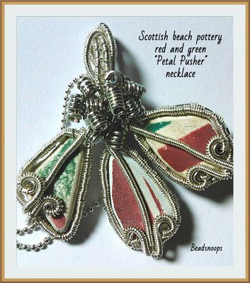 Beadsnoops: www.etsy.com/shop/beadsnoops Wire wrap weave...Red and Green Scottish beach pottery "Petal Pushers" necklace I think I am just a little obsessed with creating these awesome "Petals"... I just couldn't wait to create something awesome just for you. When creating this lovely necklace pendant...I chose these lovely three pieces of Scottish beach pottery...the outside two pieces look almost similar but the center one I wanted to be different than the others. I wire wrapped each petal individually in silver tone wire, then intertwined the three petals together to form the flower petals. I added the coils to the top and a woven bail to finish this piece off. Necklace measures approximately 24 inches in length Pendant measures approximately 2 inches in length bail included in measurement Pendant measures approximately 2 1/4 inches in width. https://www.etsy.com/listing/565881413/wire-wrap-weave-red-and-green-scottish?ref=shop_home_active_3