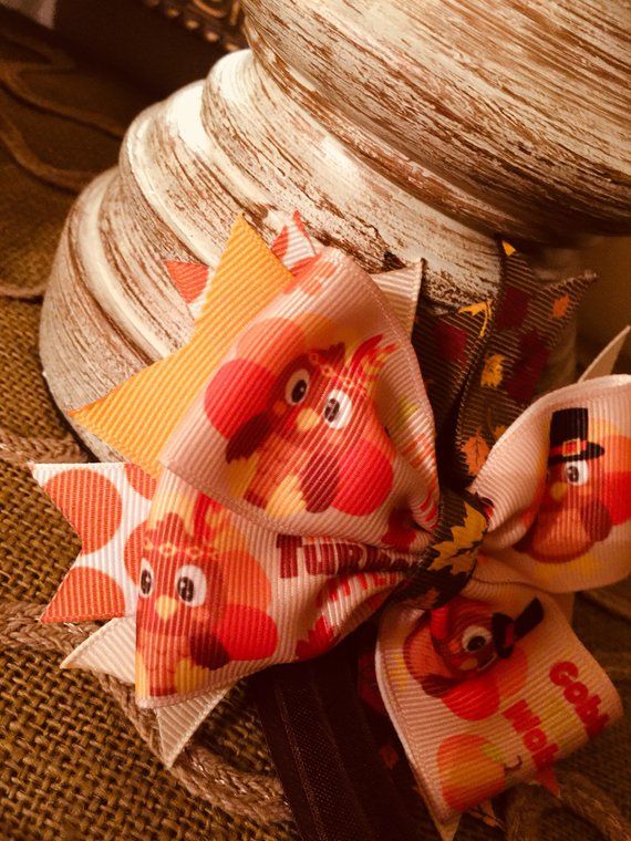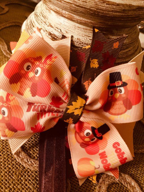 Thanksgiving Boutique Hair Bow with Headband in brown, gold and orange Headband Size: 0-12 months Bow Size: 5 inches across Bow Material: Crossgrain Ribbon in assorted colors and patterns Headband Material: Satin Brown Elastic Item is ready to ship. All items in my shop are made in a smoke and pet free environment with quality materials. (To purchase click on website link under contact information)