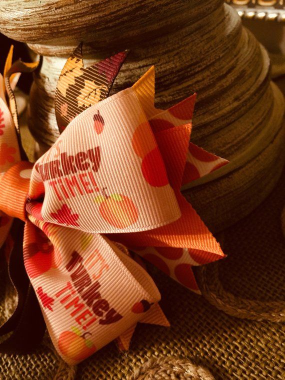 Thanksgiving Boutique Hair Bow with Headband in brown, gold and orange Headband Size: 0-12 months Bow Size: 5-6 inches across Bow Material: Crossgrain Ribbon in assorted colors and patterns Headband Material: Satin Brown Elastic Item is ready to ship. All items in my shop are made in a smoke and pet free environment with quality materials. (To purchase click on website link under contact information)