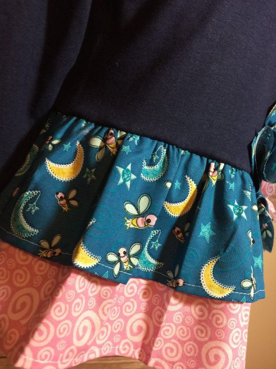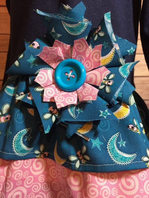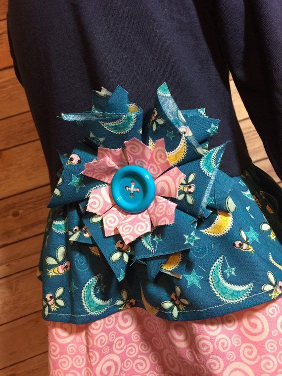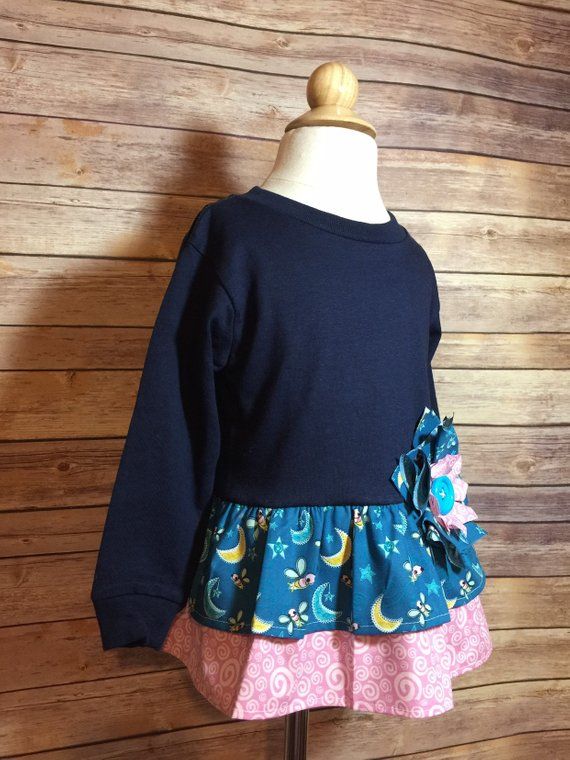 This is an adorable toddler girls tunic upcycled from a cotton t-shirt. The flounce on the tunic is ruffled lightening bug and moon with an underskirt ruffle of pink with white swirl 100% cotton. To set this adorable top off it is accented with an oversized shabby chic flower and large button at the waistline. The long sleeves make it perfect for the fall and winter months ahead. All seams are serged for a finished and professional look. Item created in a smoke and pet free environment.