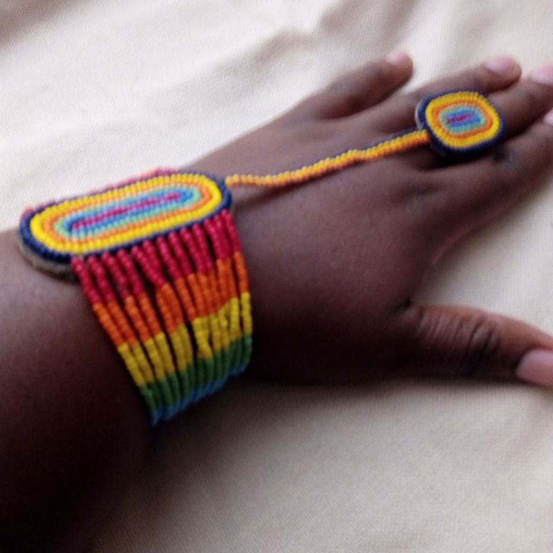 This bracelet comes with a ring made of beads. Its mainly worn during weddings. Its a good accessory for a kitenge outfit. The bracelet was mainly used by the Zulu during traditional weddings.