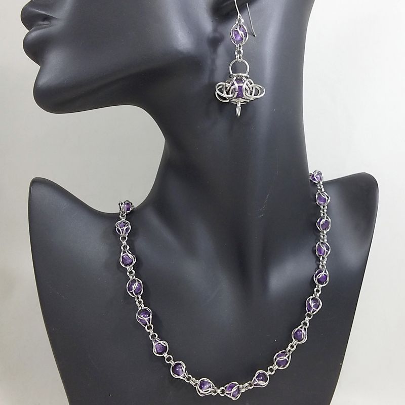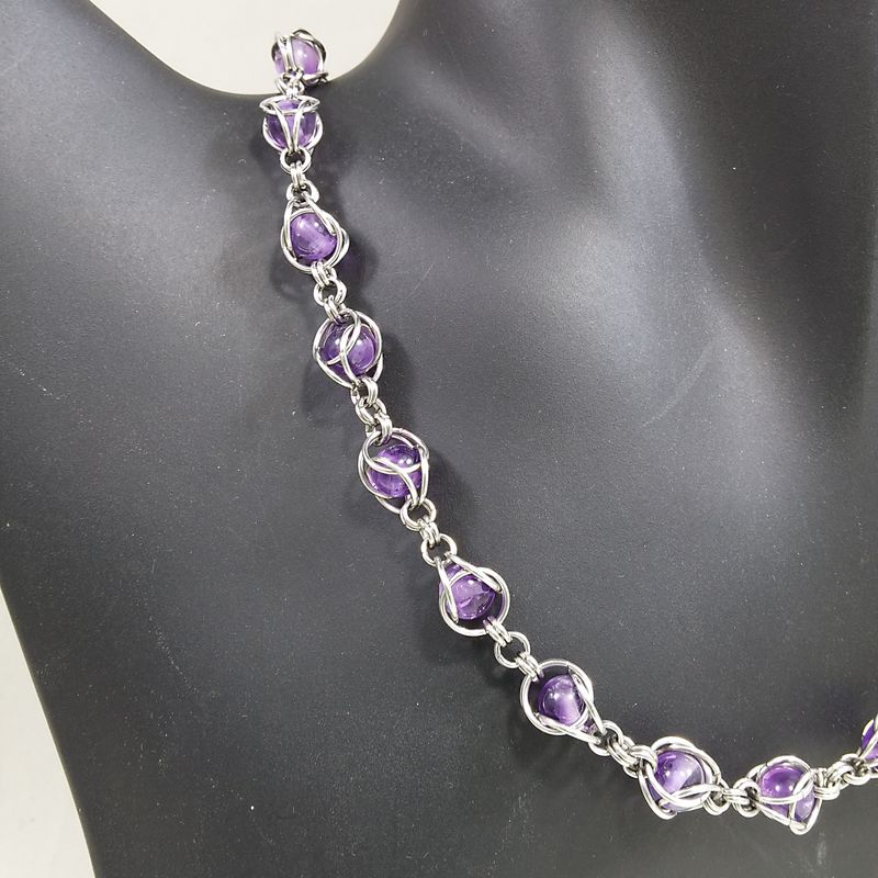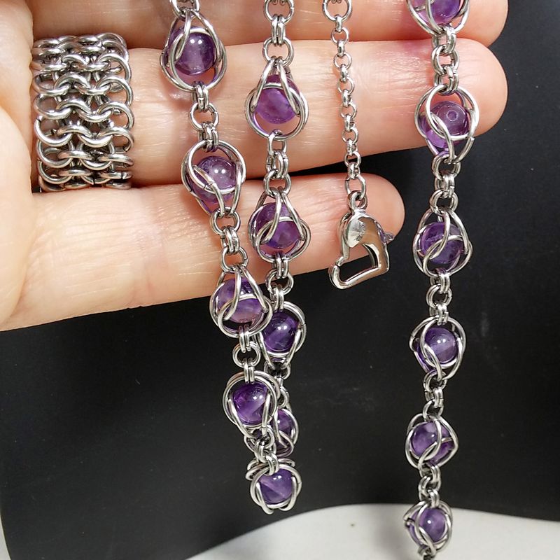 Gorgeous Elegant Amethyst Necklace with captured 5mm amethyst beads in Stainless Steel Chain Mail. I have made these using 7mm and 4 mm jump rings. Stainless steel beautiful lobster clasp closure, 18.5" length. Matching earrings available in another post here : FestiJe - Artisan made Jewelry FestiJe