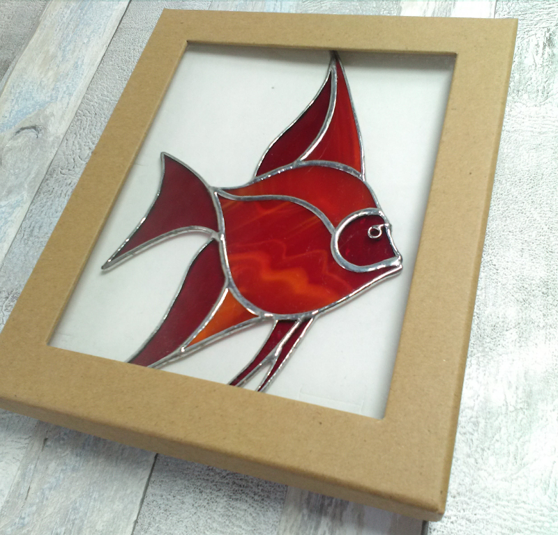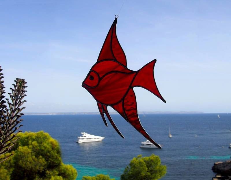 Angelfish suncatcher, handmade stained glass window decoration, which catches the sunlight beautifully. 📏 Size: 19 x 11.5 cm (7+1/2" x 4+1/2") 🎁 GIFT IDEA 🐠 The perfect addition to a window overlooking the sea as a new home, housewarming or hostess gift. The red glass used to make this angelfish is stunning in the sunlight and will surely brighten up your day. It's perfectly at home in a nautical themed room and just as comfortable in any room in the house that needs cheering up. In the second image, you can see the fish looking quite at home in Majorca, where it now resides with a fellow artist. 📝 Colour: • The colour in the main image is ruby red textured and red-orange-wispy. • Other colours are available, just ask. For contrast, two types of glass will be used in the finished piece, just choose your basic colour. The suncatcher has an edge bead of solder and all the solder lines have been left silver in colour and it has a loop and chain at the top for hanging. A window sucker and screw-in hook are also supplied. ⏳ As it's a made to order item, please allow 5-10 days for production. 🛃 Please note that this item ships from the Czech Republic (EU) and all customs and tax duties, to non EU countries, are the responsibility of the buyer. Thank you for understanding.