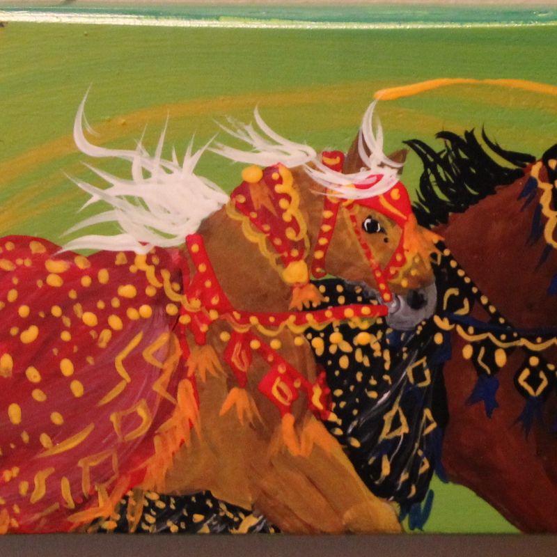 Beautifully detailed Arabian Horses in full costume gallop off to trick or treat. This is a great gift for the Halloween and horse lover in your life. Hand Painted sign measuring 12" x 3.5" made out of reclaimed lumber on a twisted wire hanger. This sign features two Arabian horses in full costume. The lettering is in black with purple glitter on a vivid green background with yellow swirls. Sign is sealed for indoor/outdoor use. To purchase go to: https://www.etsy.com/listing/204238098/trick-or-treat-halloween-ooak-costumed?ref=related-3