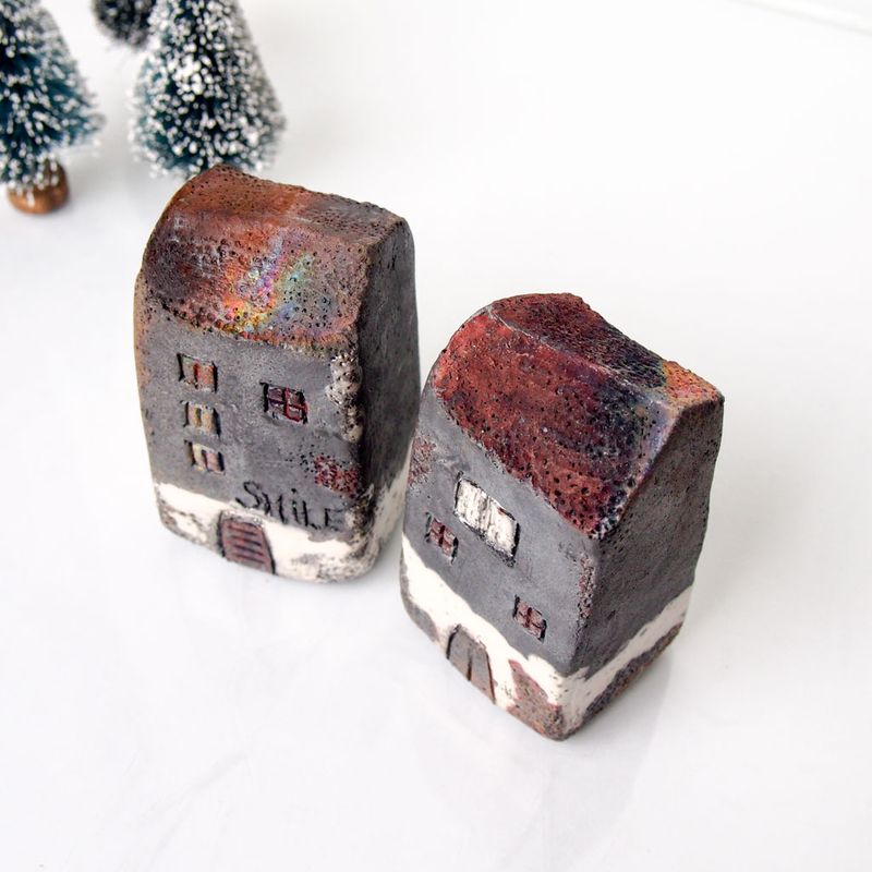 Raku pottery fired Ceramic house, Hand sculpted houses are perfect for a little nook of the house. It is unique and collectibles. With this listing you will receive two (2) houses. Dimensions aprox: 8cmx4cm Each house is hand formed and no molds are used, so no two will be exactly the same. This handmade item may have some unique features which makes it all the more special. Each house and tree set comes with a special organza bag, which also serves as a lovely and decorative gift wrap ready for giving or keeping https://www.etsy.com/listing/567970499/art-raku-fired-ceramic-houses-handmade?ref=shop_home_active_5