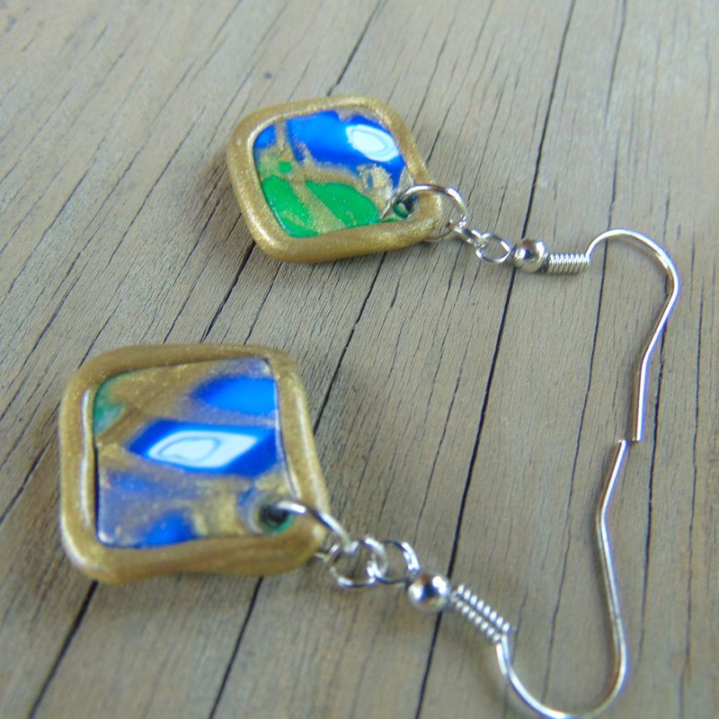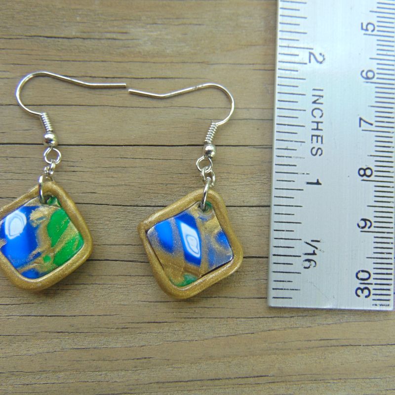 Looking for something to add to your outfit's artsy look? Look no further! These beautiful clay earrings were handmade by me using the polymer clay hidden magic technique, which requires layering different colors of clay, pressing a stamp onto them, and then cutting down to the indent. The earrings were then coated with gloss for extra shine and protection. They sparkle in the sun and are one of a kind pieces of jewelry. Each charm is about 3/4 inch long. https://www.etsy.com/shop/SolarCrush