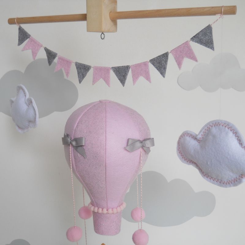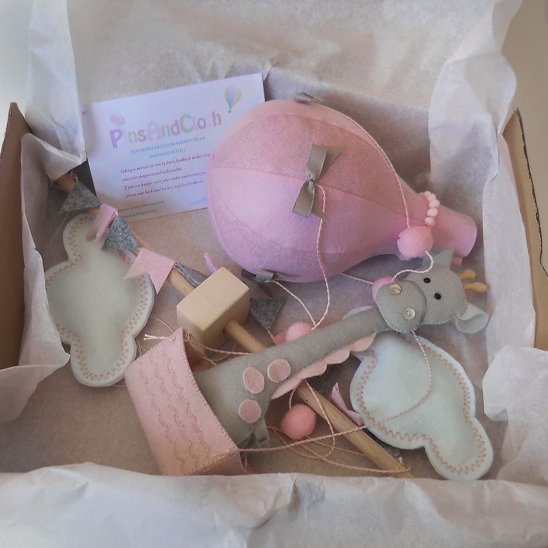 A baby girl mobile with a baby giraffe travelling in a hot air balloon. A perfect addition for a baby girl nursery. Created with an extra large ballon (diameter 6” height 7,5”). The right nursery decoration in a travel theme nursery. Under request (no additional cost) you may customize with baby's name stitched on a cloud or on the bunting flags. Entirely hand-cut, hand-sewn with embroidered and beaded details . Made of anallergic and eco -friendly best certified italian fabrics and stuffed with anallergic polyfil. ✪ FULLY CUSTOMIZED - Before placing your order , pick your favorite fabric colors that better match the nursery room . Mail me and I can sent you other photos of the fabric colors. Customize your mobile ! ✪ SIZE : 23“ height,top hanger 14”wide. Balloon diam.6” x 7,5 high, giraffe 9,8 high X3” wide, basket 3,5 X2” ✪ In the box you will have what you can see in the photo, in addition 3 yards of cord for ceiling hanging. The mobile arm to hang from the crib is not included. Use a cup hook for ceiling hanging or a decorative plant hanger arm to hang from the wall. This is STRICTLY for decorative purposes and should never be within reach of babies or small children under 3 years of age. The tiny parts are a choking hazard for little ones. Gift-wrap available. ✪ Current turnarround 3-5 days after placing your order. SHIPPING BY UPS DELIVERY 2-3 WORKING DAYS WITH TRACKING NUMBER. Each mobile is an adorable work of art made with very much love. Any questions please contact me. E-mail: pinsandcloth@libero.it Looking forward to hearing from you soon. Cheers, Carmen ✿ ✿ ✿