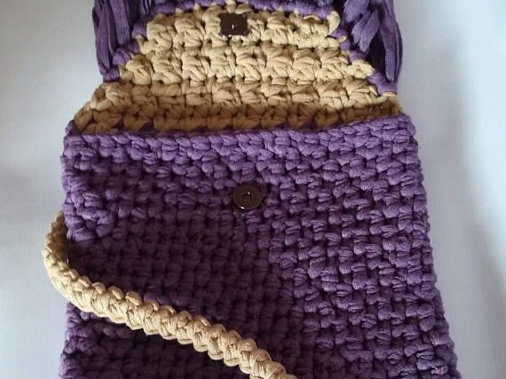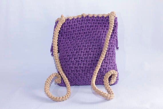 Backpack Crochet Bag Handmade Boho Style Free Shipping!!! A fashionable Backpack, handmade decorated with tassels, a combination of Deep Purple and Sandy Beige colors. This summer backpack is a must, when you combine it with a boho style is a TREND!!! Magnetic Purse snap as a close button. Cotton RIbbon Yarn. ♥ Fashionable and stylish for any occasion. Boho style, ethnic and chic. ☑ Measures 27cm x 23cm