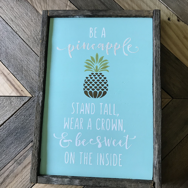 Be A Pineapple, stand tall, wear a crown and be sweet on the inside Sign! These signs are hand crafted and one of a kind. Perfect gift for a house warming, hostess gift, shelf decoration or just a unique way to say Thank you. Fun, lovable and unique....perfect sign to give as a gift or keep for yourself 😊 This cute little sign will add that special farmhouse touch to an entryway, bedroom, living room or any room of the house. The possibilities are endless! This beautiful sign measures approximately 12 inches x 8 1/2 inches. Beautiful hand crafted and one of a kind sign. Perfect gift for a house warming, girls night, wedding or hostess gift, shelf decoration or just a unique way to say Thank you. This cute little sign will add that special farmhouse touch to an entryway, bedroom, living room or any room of the house. The possibilities are endless! Please note, because these signs are handmade, each one may vary slightly and will provide you with a very unique item. Please feel free to contact us with any questions. Thank you for visiting The Country Cowshed! Follow us on Facebook for updates, specials and more photos: www.facebook.com/thecountrycowshed For more vintage and handcrafted items, you can check out our Etsy listings here: www.etsy.com/shop/thecountrycowshed