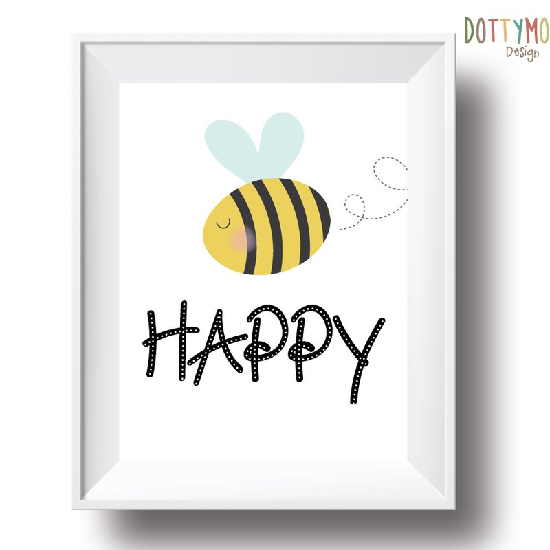 Bee Happy- print INSTANT DOWNLOAD-DIGITAL FILES ONLY If you do not have access to a printer, I'm happy to print and send via post, please contact me for details. Nursery printable wall art, print features a cute flying bee with text happy, with a white background, perfect for a little ones room or nursery, or given as a gift. -FILES INCLUDED- 5" x 7" JPG file format-1 print. 8" x 10" JPG file format-1 print. 11" x 14" JPG file format-1 print. *If you would like alternative sizes or the PDF file to resize, please email me and i will be happy to send for no extra cost..* If you would like alternative colours to the ones listed, please email me. No physical item will be shipped , frames are for decorative uses only. Print quality will depend on paper and printers used. If you are not entirely happy with your purchase, please message me, where i will be happy to help, my main priority is that you are satisfied and 100% happy. All artwork is copyright of Dottymoondesign © By purchasing this artwork you are not acquiring the copyright, and any form of duplication or distribution is prohibited. For personal use only.. Thank you...