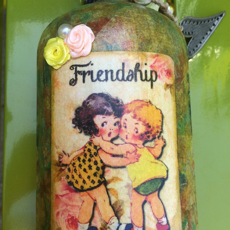 Decoupaged vintage bottle reading friendship with cute little cartoon girls and adorned with flowers and pearls with a dangle featuring a silver heart. Absolutely adorable gift for a old friend and or bestfriend.