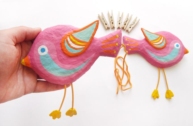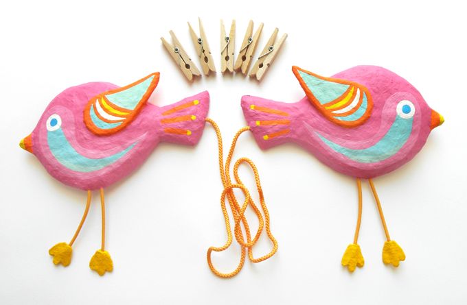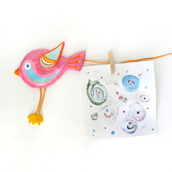 A unique paper mache birds art & photo display hanger for kids. It is sculpted by hand, painted with acrylic colors and it's a totally recycled and eco-friendly gift for your kids to put their favorite drawings or photos. Fuschia, orange, blue, turquoise, white, yellow bright colors. Perfect for any room or playroom. A special gift for your kid's room decoration or your baby shower decoration.