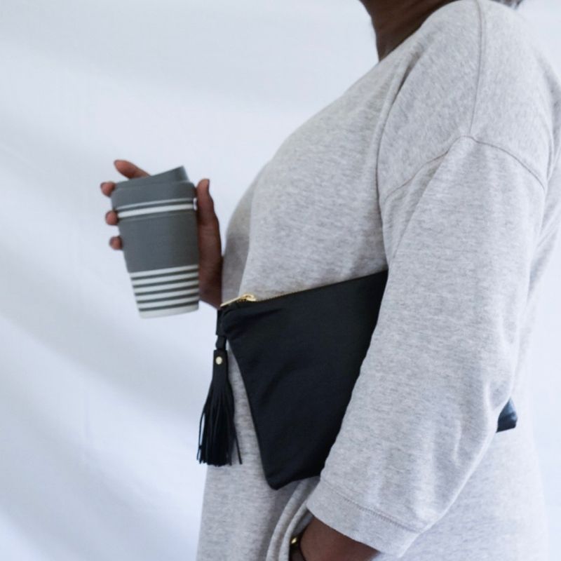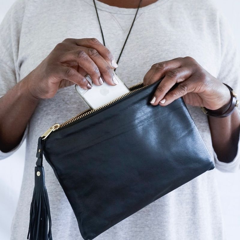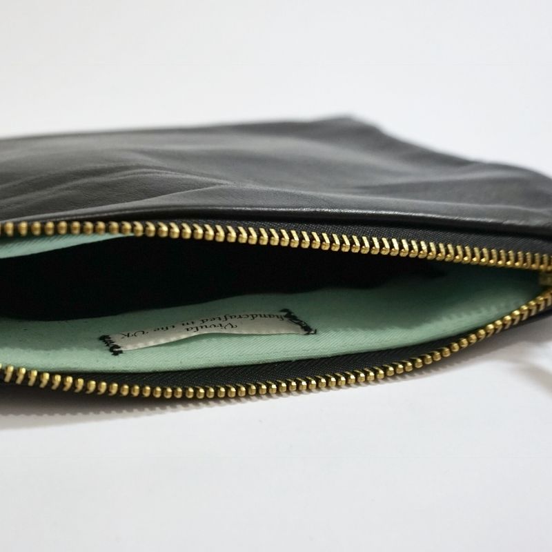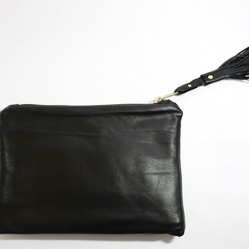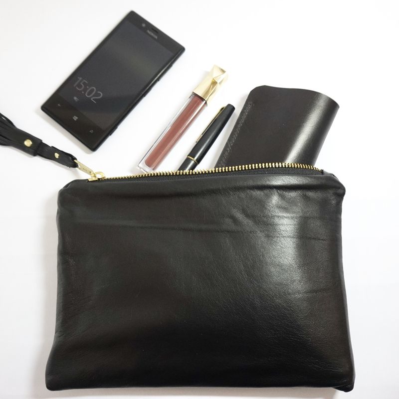 This soft, sophisticated Black Leather pouch is a very handy size.( 9” x 6”/ 22.5cm x 15cm) Large enough for your mobile phone etc, when you don't want your usual handbag and small enough to fit into your handbag; a win, win situation. The colour means that you can use it for any occasion. Casual to formal. Made from wonderfully soft leather it is such a pleasure to hold. The tassel takes it from plain to elegant. It is fully lined with a contrasting gaberdine & a pocket on the inside and the gold tone metal zip is bang on trend! I have a couple in different colours and they a great, elegant & practical addition to my wardrobe. It also comes with a free dust bag to protect it whilst it's not being used.