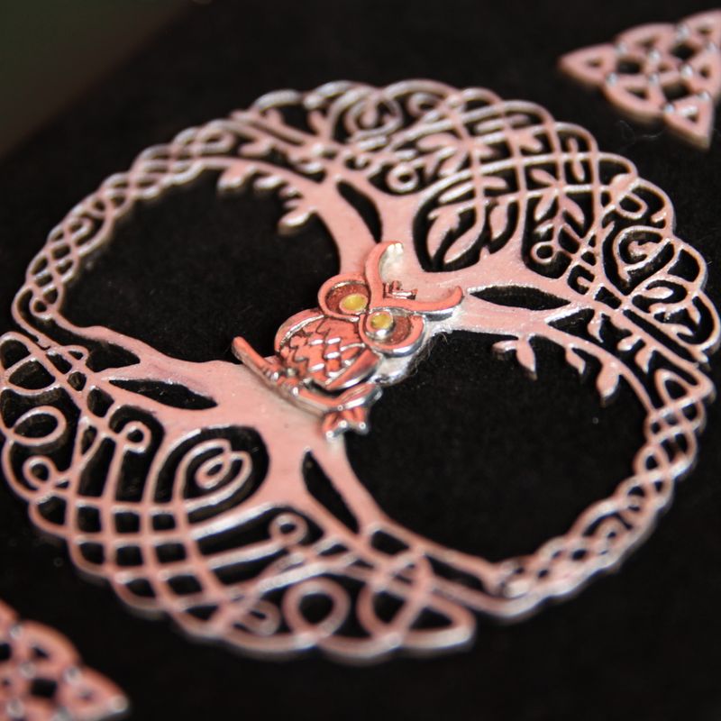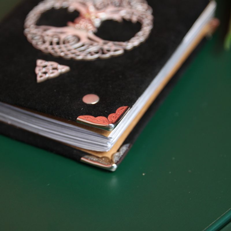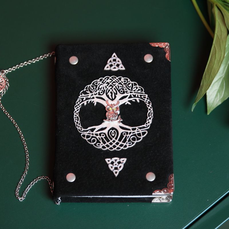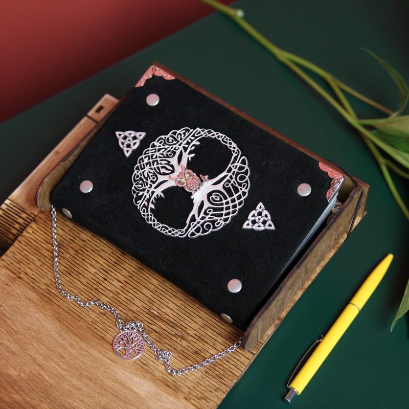 Handy and stylish, our handmade journal is the perfect accessory to keep your notes organized. This “Black Owl” notebook in Celtic style created by hands, with great attention to detail and quality. The front cover is made of real suede and decorated with metallic Triquetra, Tree of life and Magic Owl Symbols in the center. What do these symbols mean? Triquetra - is the symbol of destiny, power, strength, wisdom, leadership, and endurance. The Tree of Life is a symbol of balance and harmony. And the Owl associates with intelligence, brilliance, power, and knowledge. This bird has a gift of heightened senses which enables it to see through deception, illusion, external appearances and to find hidden truths. Please note: Pages are cut and fixed by hand. It’s 100% handmade item. Each notebook comes in a wooden box and has a bookmark. This Black Owl notebook from Crafting For You Studio is a great way to show off your personal style and keep the important notes and appointments all at once. Perfectly sized (approximately 13.5 x 18 cm) to carry in a handbag. You can also create your own set of memories, collecting our notebooks. It looks very noble. Functionality: • 200 pages (100 sheets) of white paper • Size: approximately 135 x 180 mm • Comes with natural wooden box