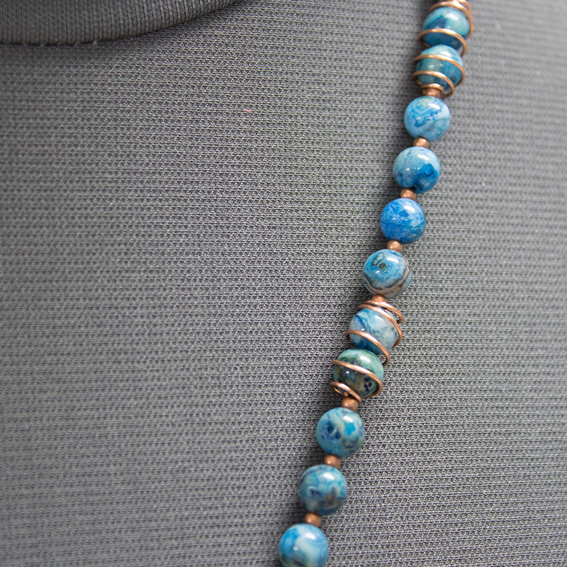 This asymmetrical necklace features a heart pendant and round beads, both made of semi-precious, blue, crazy lace agate (dyed). Copper wire wrapping enhances the natural variations of the stone. Includes copper beads, chain and findings. Dainty, wirework spirals grace the front of the pendant. This is a lovely, eye-catching design--suitable for a night out on the town! Also, makes a wonderful gift for someone special. I'm happy to do custom orders, if you want a similar design with different beads or colors let me know! Necklace measures 24" long. Pendant is 1.75" long x 1.75" wide.