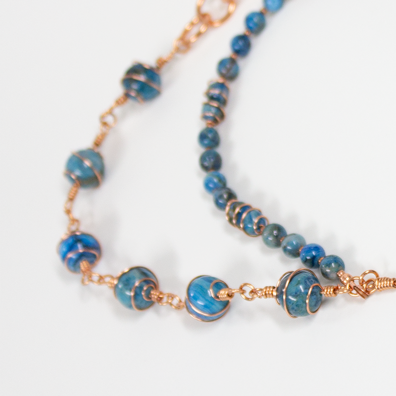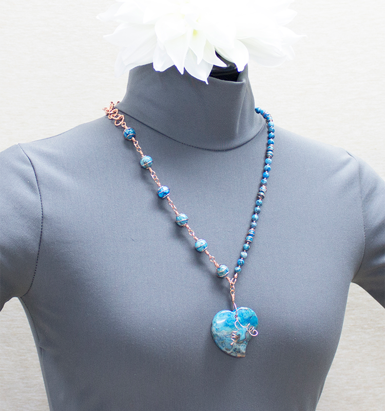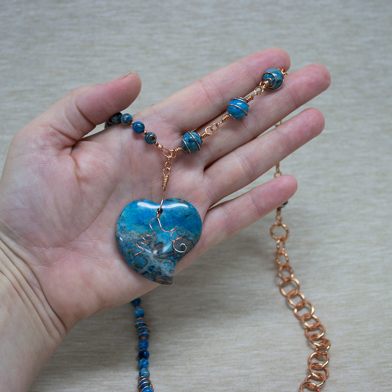 Blue agate stone wire wrapped necklace with heart pendant and copper wire