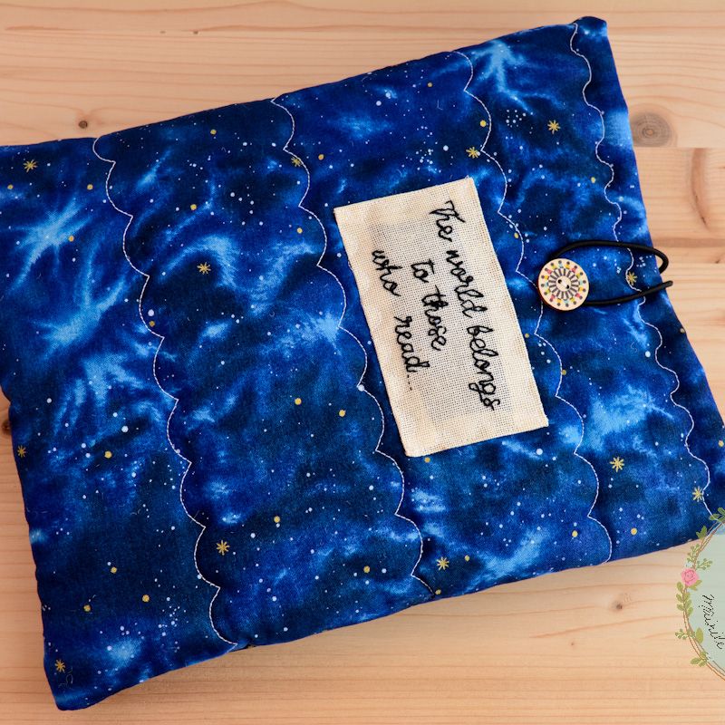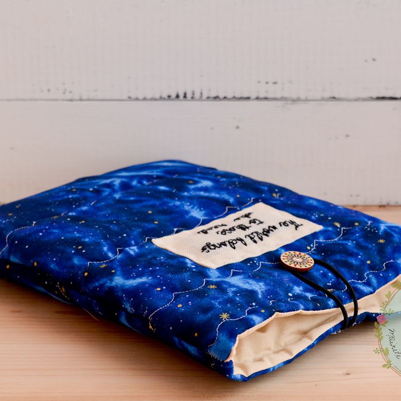Book sleeve, e-book cover, gift for reading, bookworm gift, book buddy, vintage cover, notebook cover, galaxy book cover, star gazers covers ***1 unique piece available*** This book sleeve is a great way to protect your loved and cherished books. It is light weight and perfect for throwing in a backpack or taking on the go, without the fear of damaging your book, tablet or e-reader. It is lined on the inside as well as padded to offer protection. Easy to use for regular books, notebooks, quilted, 100% great quality cotton, hand embroidered with text/name. Measurements: 8"/10", rubber band and button closure. For custom measurements, don't hesitate to contact me! ****Our products have been handmade in a smoke and pet free home!!**** With all my love, Delia