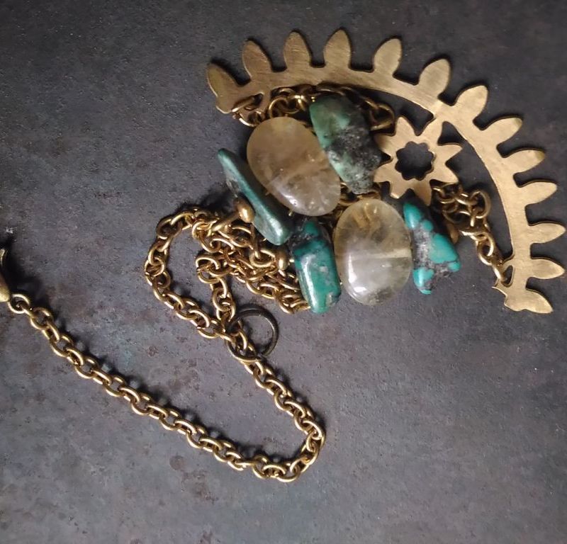 Brass flower on a half circle gemstone necklace with citrine and turquise gemstones on the chains