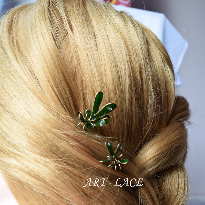 The leaves are hand-formed in a bronze tone single piece of wire. Leaves are hand painted in gradient shades of green. Spiky looks make it unique and interesting. Delicate wire wrap hair picks have tiny Swarovski clear crystals on some of the leaves. Design is unequal for each pin. Length of hair pick : 7 cm including length for stem 5 cm. Leaves cluster: 2 cm x 2 cm. If you wish to make a custom request for your choice of color, please send me a message. Not suitable for bathing or swimming. Price doesn't include shipping cost.