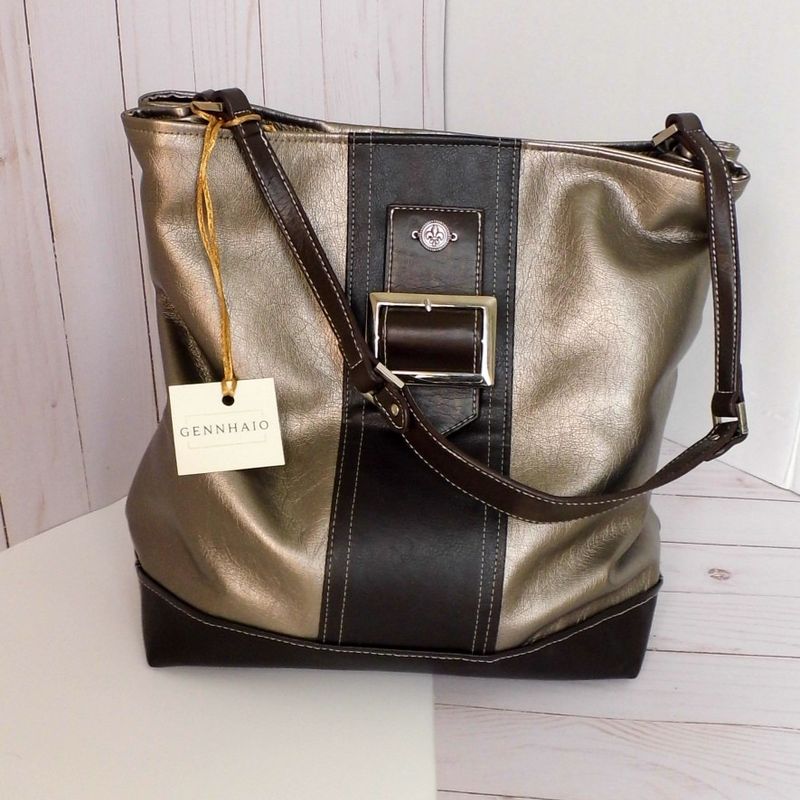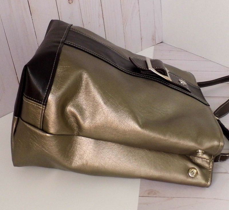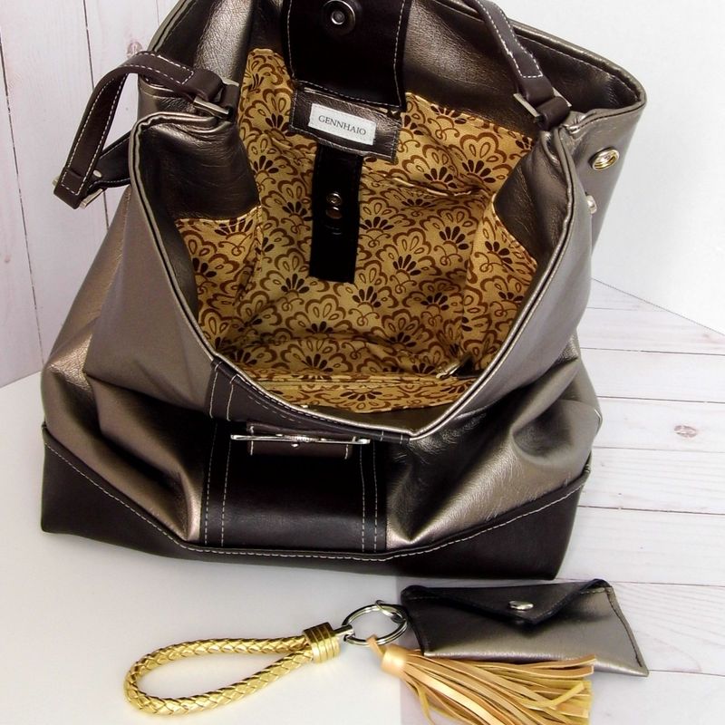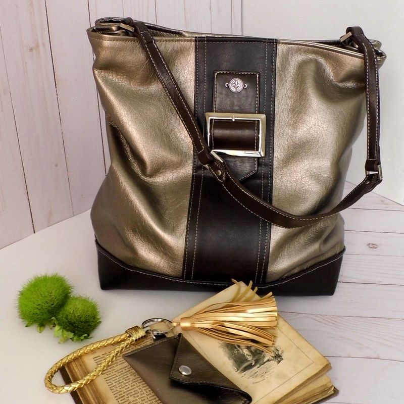 This exquisitely refashioned Tote Bag has been beautifully crafted by blending vegan leather with gently re-purposed, reclaimed, and Upcycled items. The Bronze Metallic faux leather is paired with a deep chocolate brown vegan leather. This is the perfect color combination, which will easily transition from a work-handbag to an evening out with friends with the greatest of ease. // Approximate Size // Bag size: (H) 12” x (W) 16” x (D) 5” ( 31 x 41 x 12.5 cm) Handle: (L) 20” x (W) ½ ” (51 x 1.5 cm) Lined in a complimentary cotton Paisley print, with two (2) pockets, which are great for placing your smaller items, such as your: keys, loose change, etc. Available from my Etsy shop: https://www.etsy.com/shop/Gennhaio