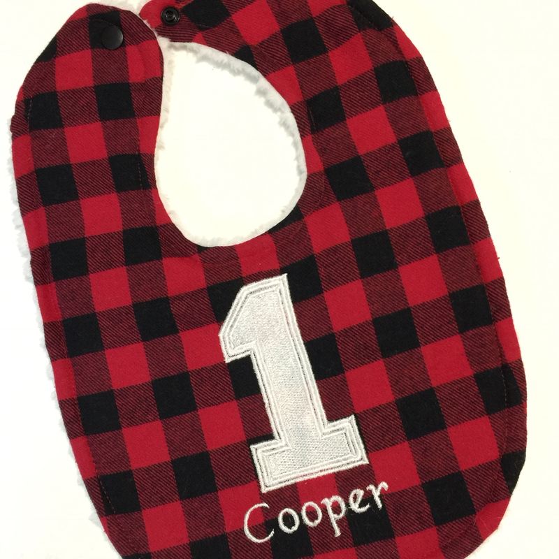 Buffalo plaid 1st birthday bib is perfect for party and cake smash. It’s nice and big to cover baby from shoulder to lap. Soft and fluffy with snap closure at neck. Personalization/Embroidery is included. Shipping within 48 hrs. Domestic shipping included