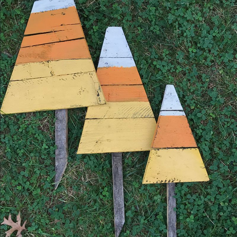 Candy Corn yard stakes, halloween yard art, reclaimed wood, candy corn, fall candy corn, lawn stakes, border decoration, fall yard stakes