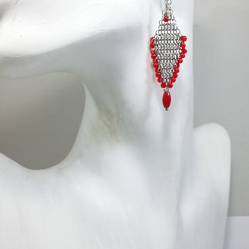 Chainmail European 4-1 weave , Red Coral & Drop Japanese Glass Earrings