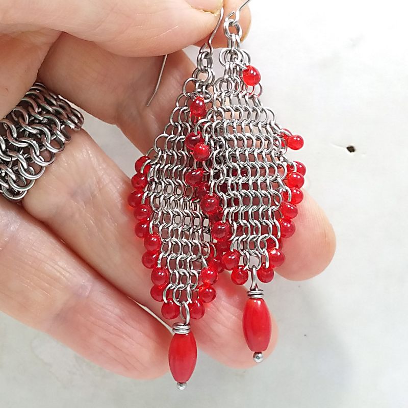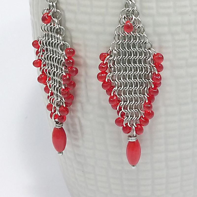 These are very beautiful Chain Mail earrings I made with lot of work with tiny 3.5mm Stainless Steel jump rings, Japanese Drop Miyki Glass beads and Red Coral Beads. They look so fluid and 'slinky' :) These earrings 3 ” from the top of the Stainless Steel Hypoallergenic ear wires. Feel free to email me with any questions and please send me a friend request too (Asia Azran). I will combine shipping with any FB auctions or my Etsy store. Thank you for looking! Smoke free & Pet love home FestiJe - Artisan made Jewelry FestiJe - Festive Jewelry by Asia Azran FestiJe #earrings #sale #handmade